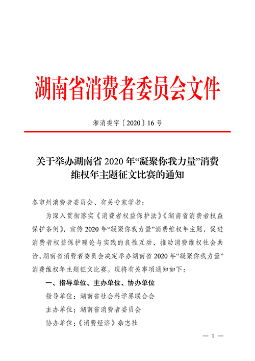 转发:关于举办湖南省2020 年“凝聚你我力量”消费维权年主题征文比赛的通知