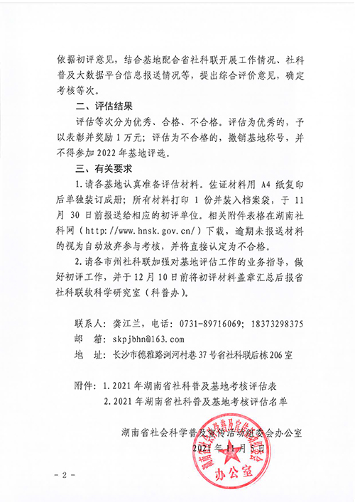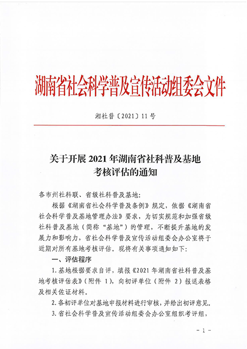 转发:湖南省社会科学普及宣传活动组委会办公室关于开展2021年湖南省社科普及基地考核评估的通知