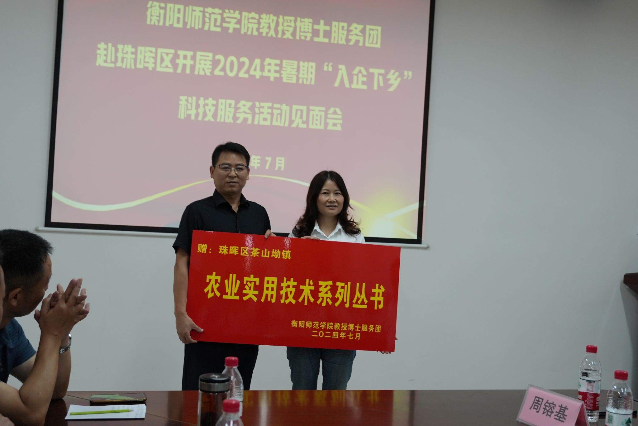 见面会上,教授博士服务团团长陈晓华博士作了表态发言。合作发展与校友联络中心主任陈梅香代表服务团向茶山坳镇、酃湖乡捐赠了农业技术系列丛书。
